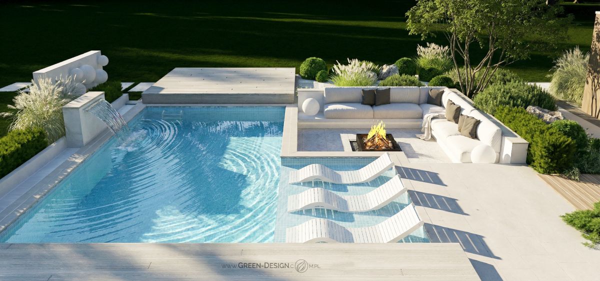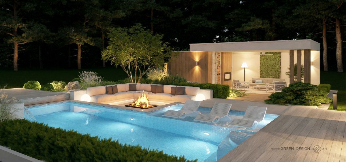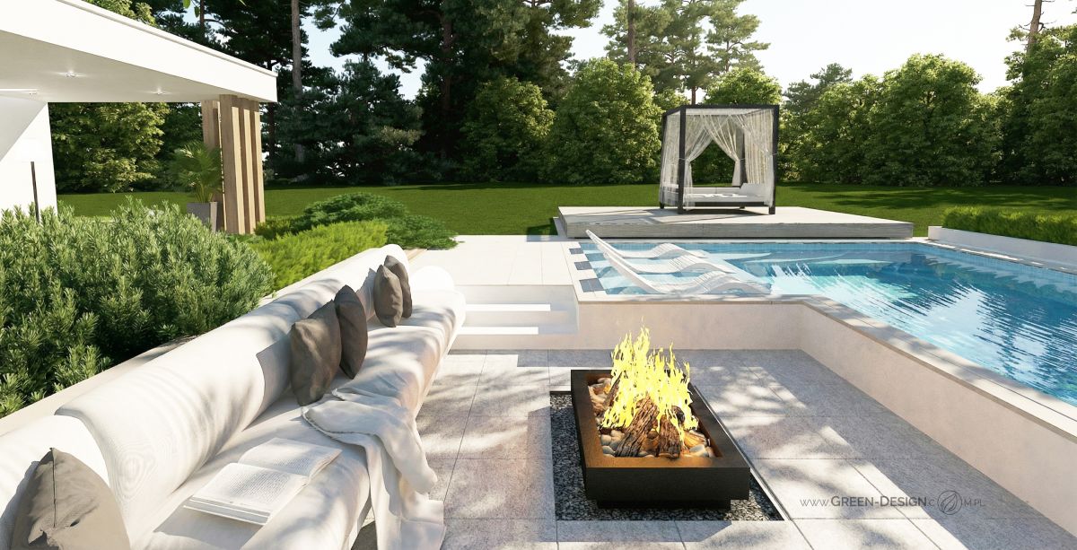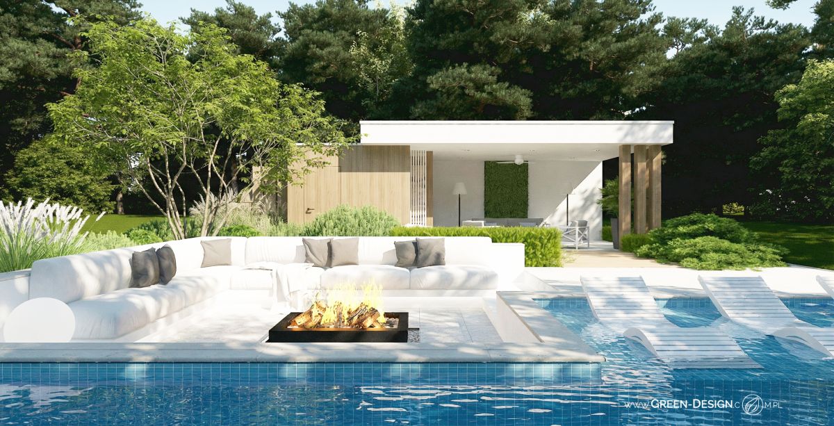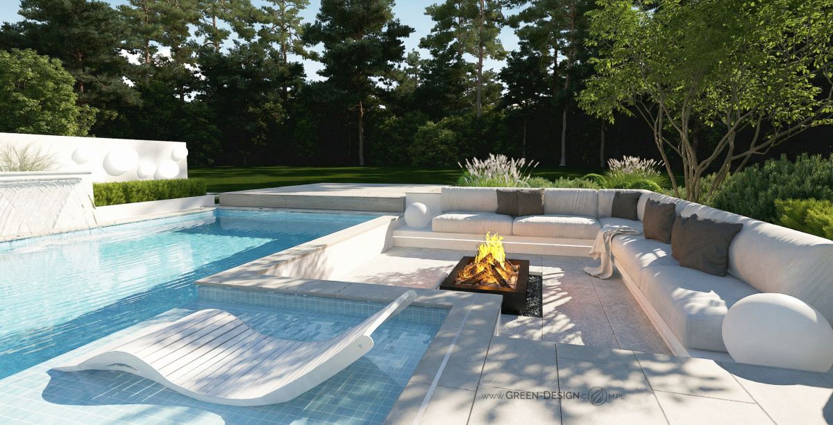 Po przeciwnej stronie basenu zaprojektowałam narożną sofę zintegrowaną z paleniskiem ogrodowym. To idealne miejsce na wieczorne spotkania z przyjaciółmi. Otoczona zielenią i niskimi krzewami przestrzeń jest częściowo ukryta, dzięki czemu zapewnia poczucie intymności, nawet w większym ogrodzie.