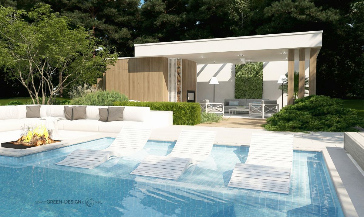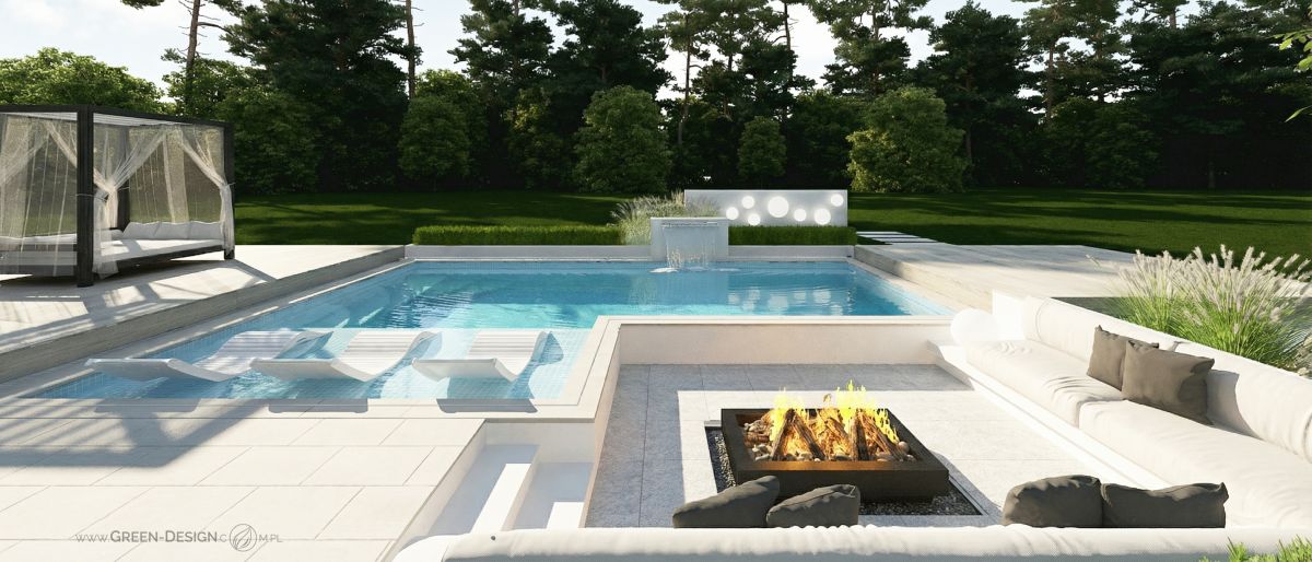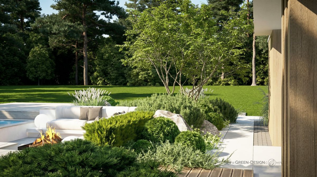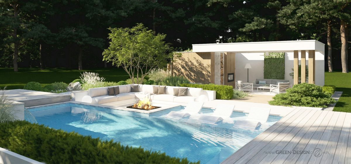 Po przeciwnej stronie basenu zaprojektowałam narożną sofę zintegrowaną z paleniskiem ogrodowym. To idealne miejsce na wieczorne spotkania z przyjaciółmi. Otoczona zielenią i niskimi krzewami przestrzeń jest częściowo ukryta, dzięki czemu zapewnia poczucie intymności, nawet w większym ogrodzie.