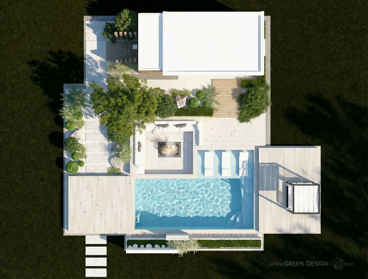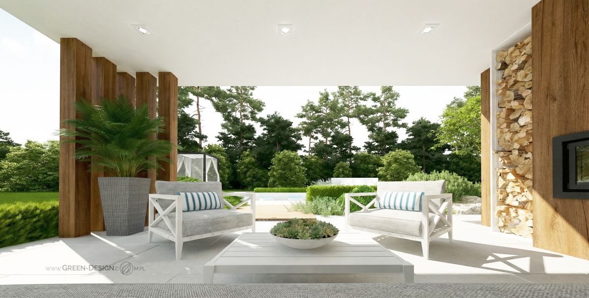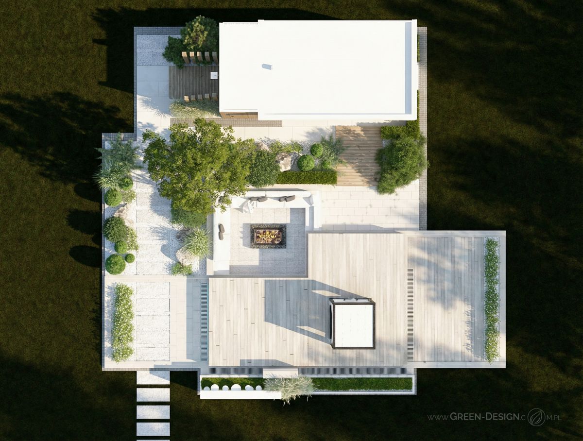 Centralnym punktem całej przestrzeni jest zadaszona altana z kominkiem i wygodnymi meblami wypoczynkowymi. To miejsce, które zaprasza do długich wieczornych rozmów, czytania książek przy lampce wina albo po prostu do leniwego popołudnia z filiżanką kawy. Kominek został zaprojektowany jako główny akcent ściany — jego obudowa i przestrzeń na ułożone drewienka tworzą przytulny zakątek, który kontrastuje z nowoczesnym, geometrycznym układem wnętrza.