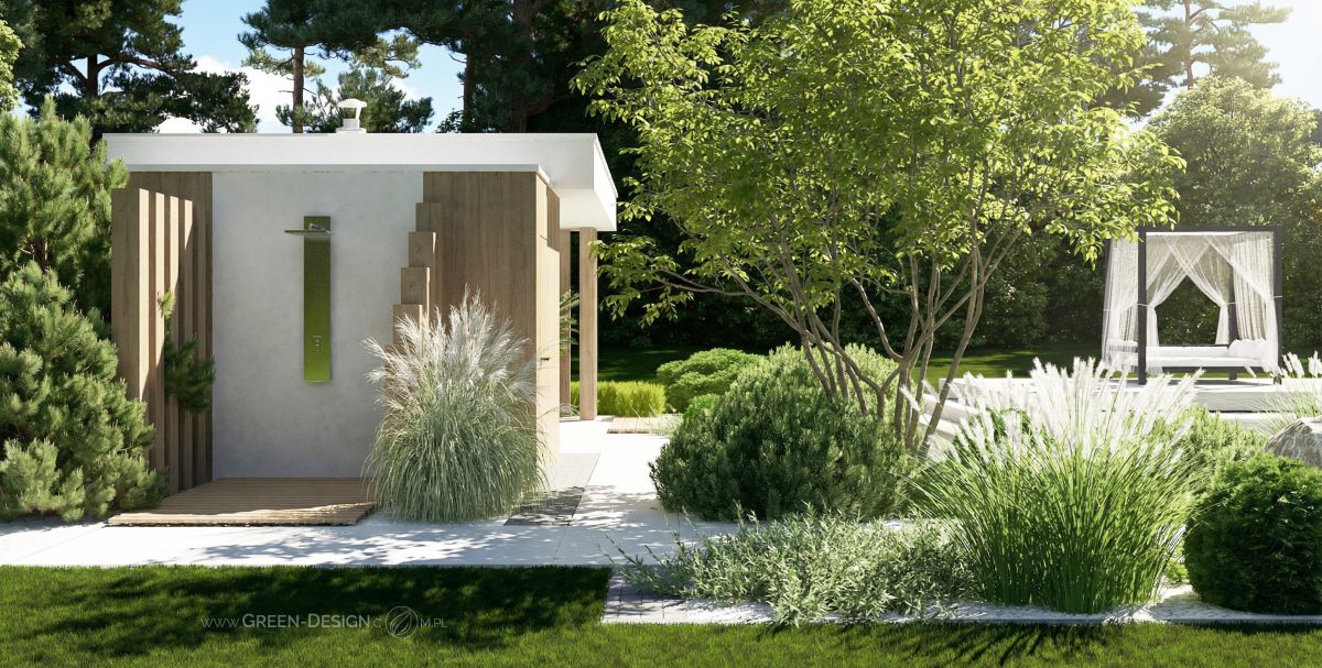 Głównym założeniem projektu było stworzenie przestrzeni, która zachęca do odpoczynku, jest funkcjonalna, a przy tym nie przytłacza otoczenia swoją formą. Efekt? Lekka, nowoczesna altana, w której każdy detal został starannie przemyślany. Całość ogrodu utrzymana jest w minimalistycznej, jasnej stylistyce, pięknie kontrastując z soczystą zielenią roślin. Dominuje tu biel, drewno i naturalny kamień – materiały, które idealnie wpisują się w klimat nowoczesnego ogrodu.